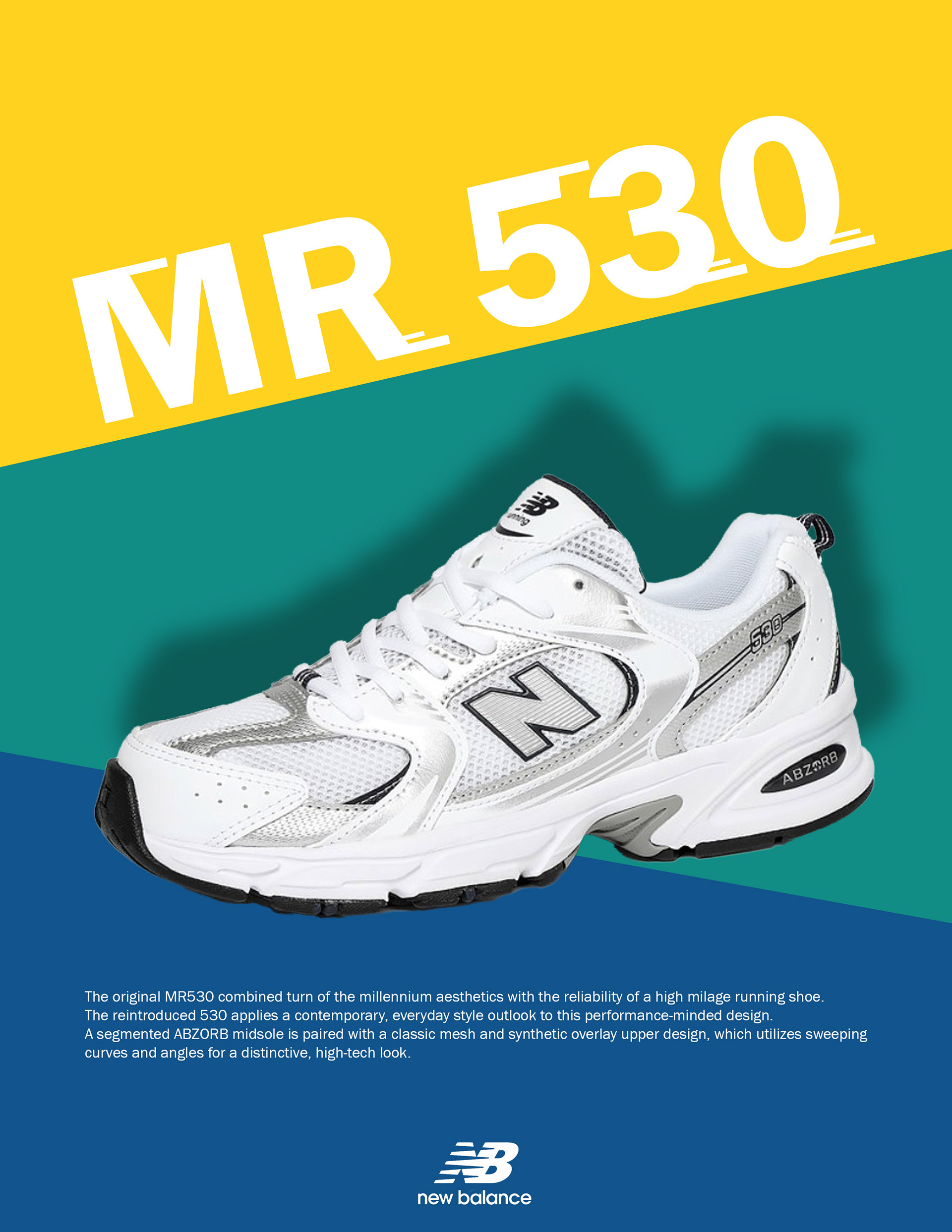 The New Balance 530 blends retro running aesthetics with modern performance, but its identity as a functional running shoe has often been overshadowed by its popularity as a fashion item. This poster was designed to reframe the 530’s image—highlighting its lightweight build, cushioning, and stability to reinforce its technical value.